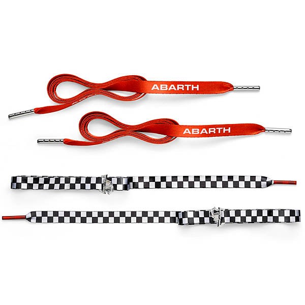 これぞまさに足元キリッ!のアイテム、ABARTH純正シューレース(靴紐)の登場です。ABARTHのレーシングスピリットを凝縮した2タイプのデザインがセットになっています。真っ赤なレースに白いABARTHロゴがプリントされたもの。そしてもうひとつはチェッカードフラッグをモチーフにしたタイプです。それぞれお好みに合わせ使い分けるもよし、左右でレッド&チェッカードフラッグの組み合わせ、なんて楽しみ方も。
