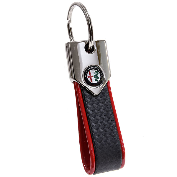 Alfa Romeoのスポーティなイメージ満載のキーリングです。ストラップ部分はカーボンルック仕上げ。そこにホワイト/レッド/イエロー/シルバー各色トリミングが絶妙に配されています。