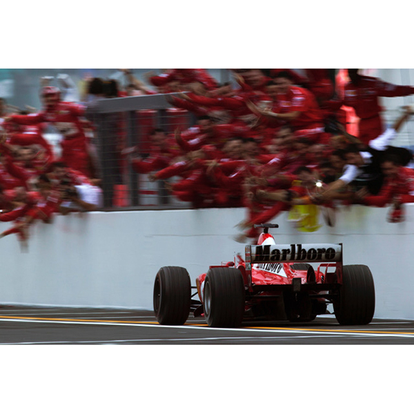 作品は2003年、黄金期の真っ只中のScuderia Ferrari。最終戦鈴鹿で4連勝6度目の記念すべきタイトルを決めた歴史的瞬間の一枚。クルーたちがピットウォールに集まり、走る抜けるシューマッハ。ホームストレートが真っ赤に染まる風景は、勝利者のみに与えられた最高の瞬間です。