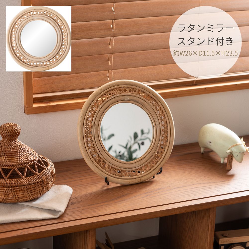 ラタンミラー スタンド付き MR-718 壁掛け 鏡 ミラー 丸型 ウォールミラー 壁かけ 卓上 アジアン 北欧 おしゃれ かわいい 化粧鏡 寝室 ドレッサー