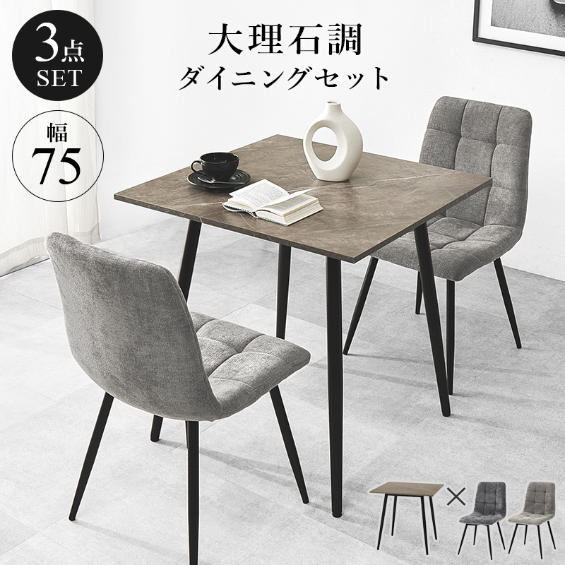 〇モダンインテリアに映えるグレーの大理石調のテーブルに陰影が美しいファブリックチェアを合わせた3点セット。