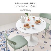 〇滑らかな曲線が美しいスッキリとした1本脚の円形テーブルに、くすみカラーと丸いフォルムがかわいいデザインのチェアを合わせました。