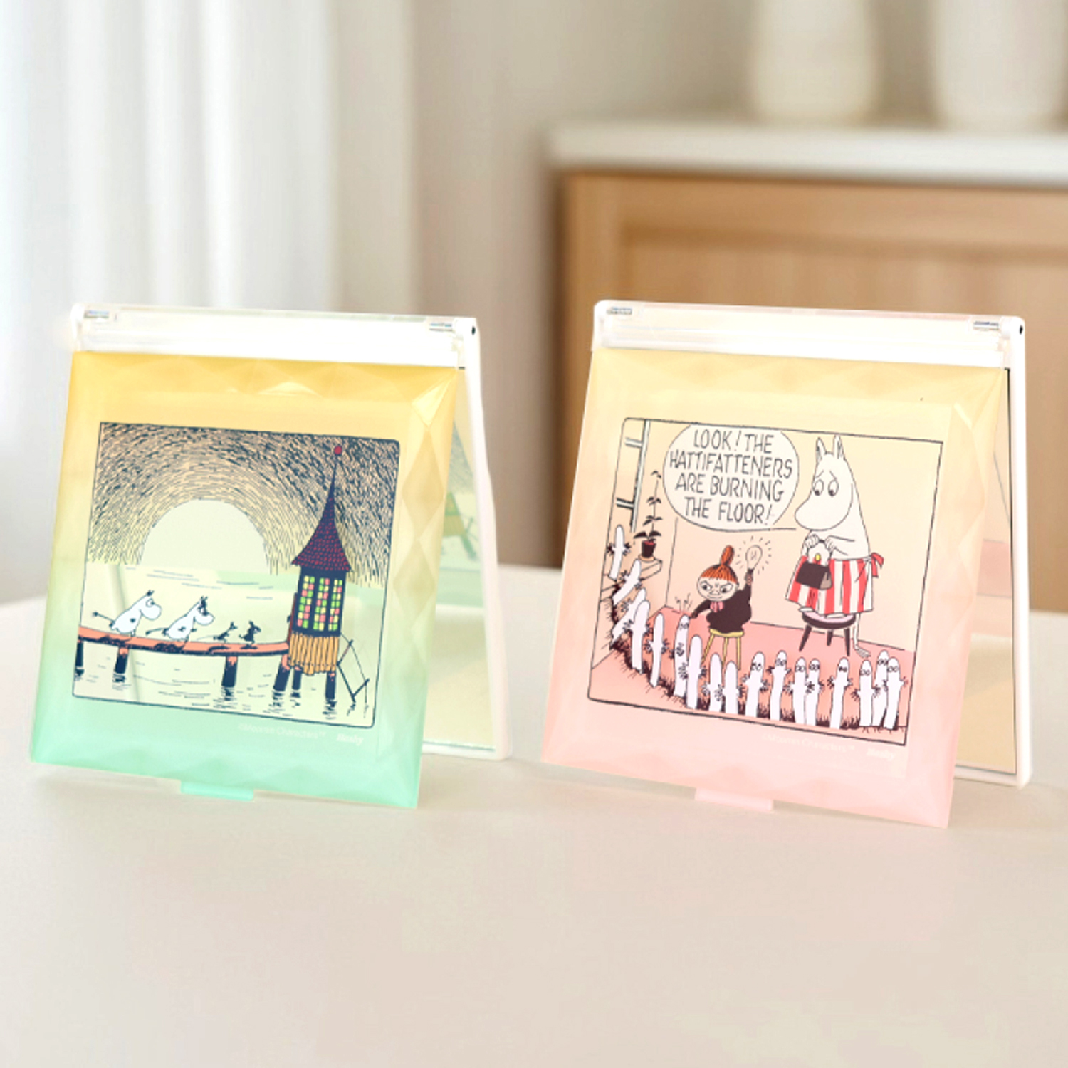 ●ムーミンたちが夏を過ごす水あび小屋の風景。水面がきらめいて見えるようなデザインと、リトルミイが持つ電球がキラっと輝いて見える、遊び心のあるデザイン。