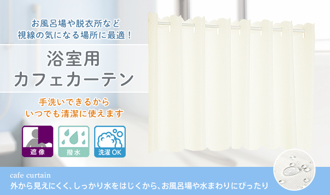 | カーテン生地で一般的に使われているポリエステル100%の生地に、水滴をはじき落としやすくなるように、撥水加工を施したカフェカーテンです。 シンプルでプレーンな柄は、どんなお部屋にもしっくりと馴染みます。※写真は、幅145cm×丈75cmの商品を使用しています。 「撥水加工」とは、生地の表面が水を弾くようにする加工です。この加工をした生地に水がつくと、玉のような水滴となって転がり落ちていくため、生地は濡れにくくなります。また、汚れが生地に浸透しにくく清潔さを保ちます。 透けにくい生地なので、浴室・キッチン・小窓などで視線をしっかり遮りたい窓におすすめです。 ぬいぐるみの顔が見えますか? 透けにくい素材でプライバシーを保護。20cmも離すと影がはっきりしなくなります。 取り付けは簡単。突っ張り棒を使っていろいろな場所につけることができます。(突っ張り棒は直径約20mmまでOK) 手洗いで洗濯ができますので、いつでも清潔に保つことができます。 【取り扱いのご注意】使用後(入浴後)は、汚れを洗い流し乾燥させてください。汚れや湿気はカビ発生の原因となります。 生地の拡大 サイズ 幅145cm×丈45cm 色・柄 アイボリー 素材 ポリエステル100% 特徴 撥水、遮像、洗濯OK(手洗い・ウォッシャブル) 付属品 なし 生産国 中国 透ける度合 お手入れ方法 商品発送の目安 翌営業日の発送となります。詳細は「配送について」をご確認ください。 撥水機能付きの浴室用遮像カフェカーテンカフェカーテンにおすすめのつっぱり棒 |