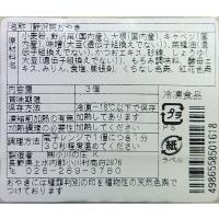 原材料/小麦粉、野沢菜、大根、キャベツ、味噌(大豆(遺伝子組換ではない))、菜種油(遺伝子組換ではない)、かつおエキス、砂糖、しょうゆ(大豆(遺伝子組換ではない))、もろみ調味料、酵母エキス、みりん、食塩、膨張剤、くちなし色素、紅花色素