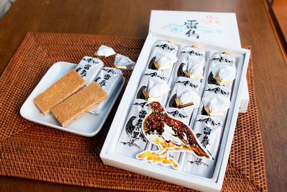 北アルプスを象徴する鳥"雷鳥"の名をいただいた欧風焼き菓子「雷鳥の里」。欧風せんべいにクリームをサンド。サクッとした食感と軽やかなおいしさが人気のお菓子です。お茶菓子として、コーヒー、緑茶なんでも合います。