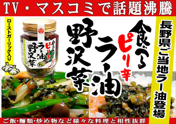 食べるピリ辛ラー油 野沢菜テレビの「旅サラダ 日本全国コレ!うまかろう!!」でおすすめされた食べるラー油野沢菜が人気です!信州名産の野沢菜とラー油が絶妙人気のお土産ラー油野沢菜は信州産の野沢菜と絶妙にマッチングしたラー油の香ばしさや食感が楽しめるお土産品で、テレビでも紹介されてさらに人気に!ローストガーリックも入って歯ごたえも抜群のラー油野沢菜はご飯にかけてもとってもおいしいです!ピリ辛のラー油野沢菜を是非お試し下さい。 食べるピリ辛ラー油 野沢菜の詳細情報品名:食べるピリ辛ラー油 野沢菜×3個ローストガーリック入りの食べるピリ辛ラー油 野沢菜|食べるシリーズ内容量 110g×3個賞味期限 製造日より約5ヶ月 保存方法 直射日光を避け常温で保存下さい 開封後はお早めにお召し上がり下さい 原材料 野沢菜、菜種油、アミノ酸液、胡麻油、ラー油、砂糖、にんにく、コチュジャン、胡麻、ねぎ、調味料(アミノ酸)、酒精、パプリカ色素、乳化剤、増粘多糖類、香辛料、酸化防止剤(V.E)、(原材料の一部に小麦、大豆を含む)製造工場で…