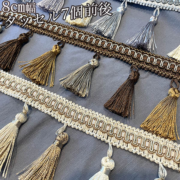 SIZE幅8cm前後 (内訳 テープ部分2cm ジョイント1cm タッセル5cm前後)×20cm(7個前後のタッセル付き)単位 20cmのお値段となります。1mの場合はお買い物かご5としてください。MATERIALレーヨン ポリエステル