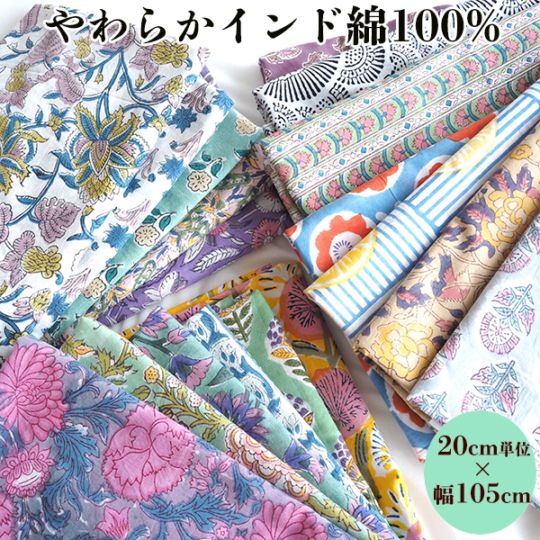 110cm幅 やわらかインド綿 花柄プリント生地 ブロックプリント コットン100% カーテン生地 クッション ハンカチ 営業日即日発送