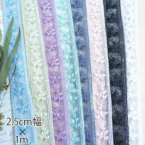 2.5cm幅 インド刺繍リボン チュールリボン メッシュリボン 小花柄スパンコールリボンブレード 推し色キンブレリボン 推し活ブローチ痛ロゼット資材 最安値 営