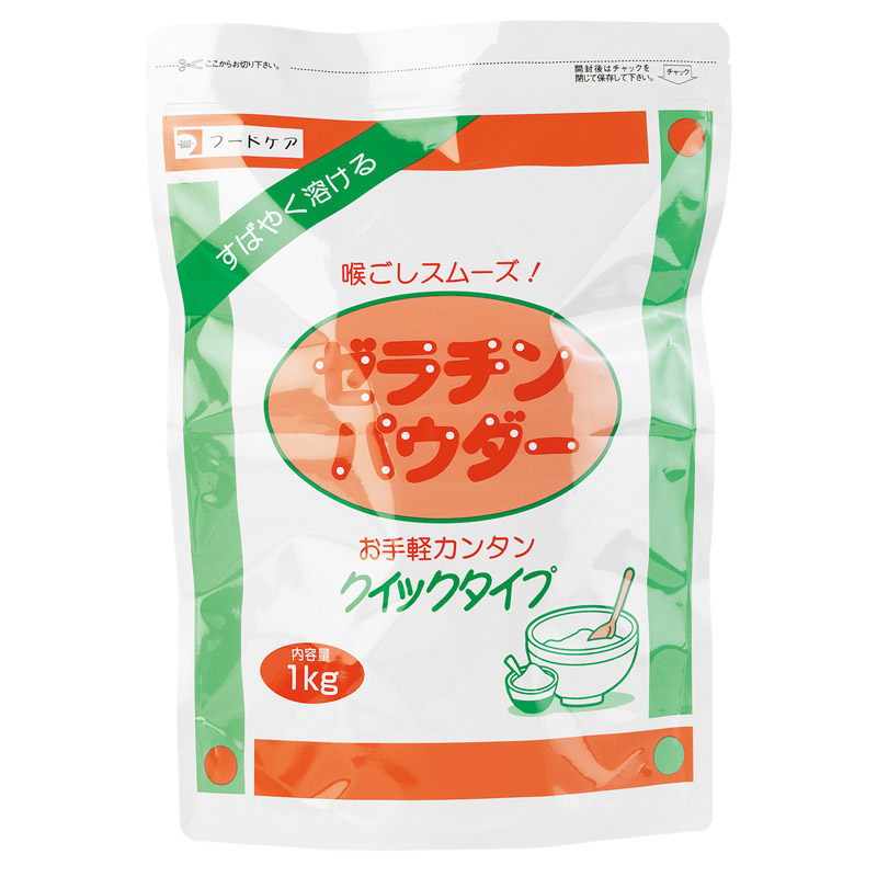 ・水にふやかす手間がなく、お湯(60℃以上)に入れてかき混ぜるだけで溶けます。 ・溶解性が優れていますので、添加したゼラチンを無駄なくご利用できます。 ・ゼラチンゼリーは、やわらかく適度な弾力性があり、喉ごしが良くスムーズに召し上がれます。 |