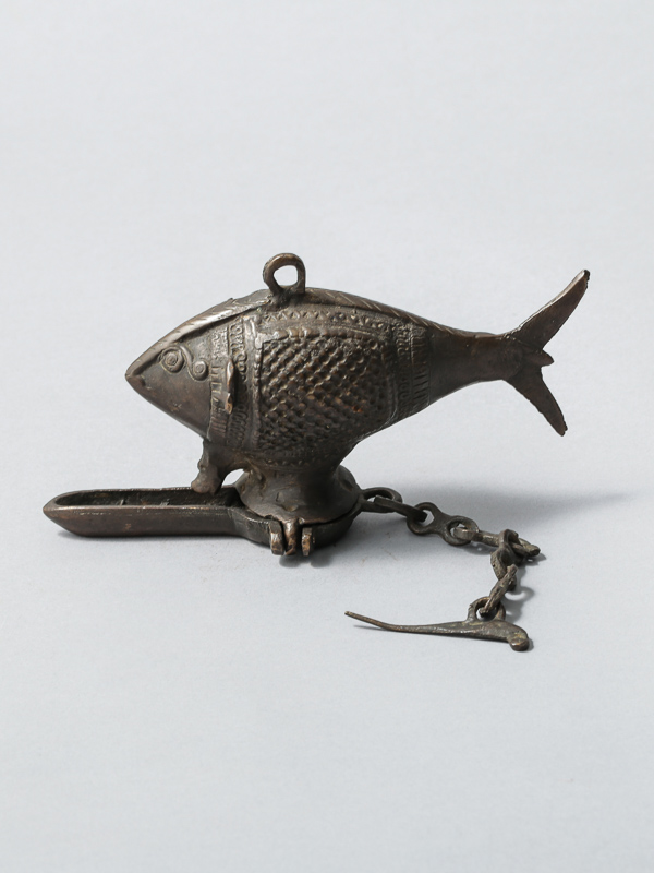 魚型の器の中に油を入れ、下に突き出した部分に燈心を置く、吊り下げ型の真鍮製オイルランプ。