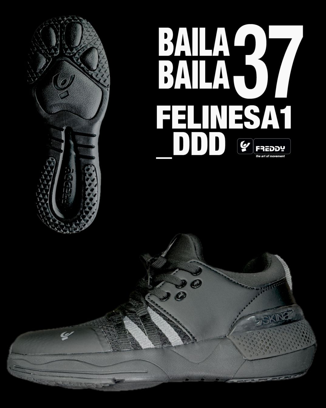 FREDDY×DDD×BAILA BAILA 限定コラボ 万能型スポーツシューズ ──BAILA BAILAオフィシャルシューズ──BAILA BAILA vol.37 BBT着用モデルベースモデルはFREDDYのFelineライン。足裏の肉球デザインが、ダンス特有のしなやかな動きと、地面を捉える高いグリップ力を両立。革新的なSkinairテクノロジーとITS 2.0衝撃吸収システムを融合し、ダンスからクロストレーニングまであらゆる動きに対応するハイパフォーマンス設計です。新開発の抗菌メモリーフォームインソールを採用。足の動きにしっかりフィットし、ずれを防ぎながら快適性を長時間キープします。通気性の高いメッシュ&ネオプレンのアッパーと、四重密度ソールによる高いクッション性で、ハードなトレーニングからダンスシーンまで、スタイリッシュに支えてくれる一足です。 NN=ブラック×ブラック