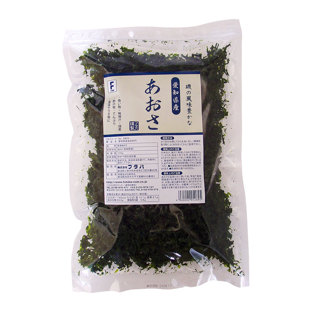 【商品の特徴】愛知県産の上質なあおさです。特殊乾燥により、色・風味もそのままに仕上げました。磯の香りが強く、みそ汁・お吸物等の椀だねに最適です。