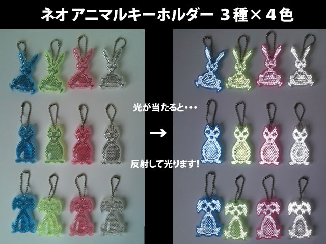 | かわいい動物の形をモチーフにした反射キーホルダーが生まれ変わりました♪ 新立体アニマルキーホルダー うさぎ・いぬ・ねこ ×3種類 長年、子供達の交通安全に活躍してきた反射板型アニマルキーホルダーがバージョンアップして帰ってきました。その名も新立体アニマルキーホルダー!!【従来品と違い】 ■ ワイド反射 従来品と比べてドーム型の出っ張りを設けて広角からの光も捕らえて反射します。 ■ かわいさ倍増 凹凸を作った事により表情が表現され、かわいさ倍増♪ ■ 外国製反射キーホルダーとの差別化 平面形状の反射アニマルキーホルダーは弊社製も含めて結構存在しております。 そんな製品との差別化が図れます。(オリジナル設計) うさぎさん いぬさん ねこさん ここでアニマルキーホルダーについてのおさらいをしておきます →アニマルキーホルダーって?? 車やバイク、電車、自転車等のヘッドライトの光を反射し運転者に注意を促すので、子供たちを交通事故から守る事が出来る交通安全グッズです。→どうぶつキーホルダーは反射鏡で出来ています! 反射鏡とは道路のガードレール等に取り付け、運転者の視線を誘導し、道しるべとなり注意を促す、交通安全には欠かす事の出来ないものです。→どうぶつキーホルダーはランドセルやカバンに付けて! 道路に使われている反射鏡の設置位置は地上より50〜100?です。子供たちがランドセルやカバンにこのどうぶつキーホルダーを付けた時も同じ位の高さなのでドライバーへのアピールもバツグンです。→活躍するのは夜だけでは、ありません! あらゆる光に反射しますのでもちろん日中でも大活躍!!通園、通学時も子供達を交通事故から守り、交通安全に役立ちます。【スペック】品 名 新立体アニマルキーホルダー うさぎ・いぬ・ねこサイズ 約6センチ色 クリア・ブルー・ピンク・ライムの4色製造者 法和株式会社その他 数がまとまる場合はご相談下さい。 ※材質はもちろんアクリル樹脂製。スチレン系樹脂と比べて透過率、反射率が高いです。 【プリズムレンズ反射キーホルダーシリーズ商品】 □定番商品 うさぎ・いぬ・ねこ型反射キーホルダー →反射アニマルキーホルダー ■アニマルキーホルダーが立体に進化した新アニマルキーホルダーはこちら → 新立体反射アニマルキーホルダー □さらに進化して蓄光機能を搭載させた反射キーホルダーはこちら → 反射アニマルキーホルダー蓄光プラス □2013年新商品 大人気のスノーマーク(雪の結晶)型を商品化 → プリズムレンズ反射キーホルダー モデル:スノーマーク(雪の結晶) □2013年新商品 こちらも人気。ハート型を商品化 → プリズムレンズ反射キーホルダー モデル:ハート □2013年新商品 定番のほし型 → プリズムレンズ反射キーホルダー モデル:スター □2014年度新商品 オリジナルくるま型 → プリズムレンズ反射キーホルダー モデル:CAR □2014年度新商品 定番の丸型直径55mm → プリズムレンズ反射キーホルダー モデル:まる □2014年度新商品 定番の長方形 → プリズムレンズ反射キーホルダー モデル:しかく □2014年度新商品 要望が多かった三角形を商品化 → プリズムレンズ反射キーホルダー モデル:さんかく □2014年度復刻 過去に人気があったクマを復刻させました! → プリズムレンズ反射キーホルダー モデル:クマ□2015年新商品 リンゴ型反射キーホルダー → プリズムレンズ型反射キーホルダー モデル:リンゴ □2015年新商品 プリズムレンズ反射キーホルダー → プリズムレンズ型反射キーホルダー モデル:ゴースト |