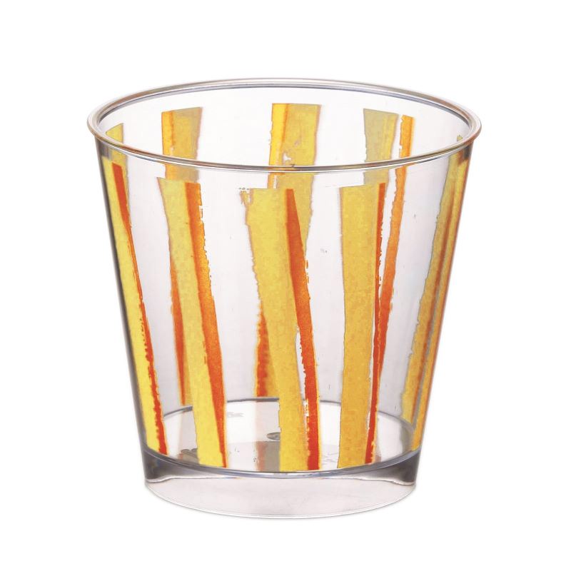 オレンジとイエローのストライプが目を引く、ポップ&カラフルなデザートカップです。コーヒーゼリー、フルーツポンチなどのデザートはもちろん、サラダやマリネなどの前菜も華やかに引き立てます。○商品サイズ(mm):74φ×71H 〇容量:180ml 〇材質:PS 〇数量:25個 〇耐熱温度:80度(オーブンや電子レンジの使用不可) 〇74φフタと合わせてお使いいただけますご使用上の注意はこちら