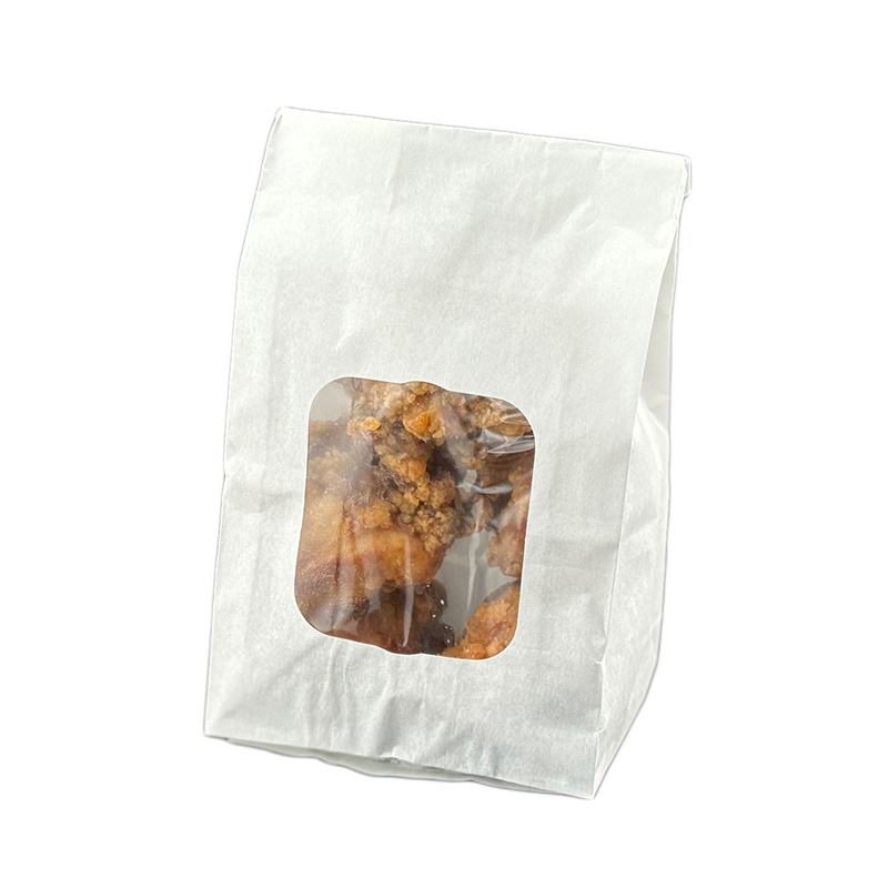 口を閉じたまま中身が見える設計のためディスプレイ効果抜群です。耐油耐水紙を使用しているため、唐揚げやコロッケ、揚げパン等に適しています。マフィンなどの焼き菓子にもおすすめです。○商品サイズ(mm):90×160×60 ○材質:耐油耐水紙50g(窓部:OPPボードン25μ) ○数量:100枚