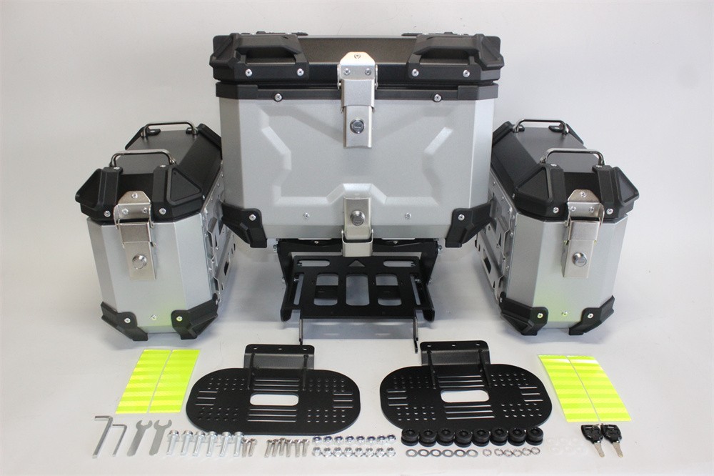 ◆アルミリアボックス 45L ツーリングボックス 専用取り付けマウントが付属しているので取り付け簡単。 防水加工あり 重量:約8kg 外寸:約330mm×約370mm×約420mm 内寸:約300mm×約320mm×約380mm 付属品:取り付けマウント、ボルトナット、鍵2本 材質:アルミニウム/プラスチック樹脂