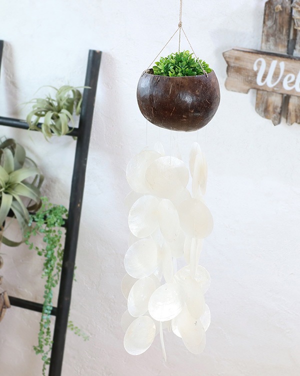 ・生産地:フィリピン おしゃれに吊るして楽しむ♪ 南国を感じるココナッツのボウルに透明感のあるカピスを組み合わせました。