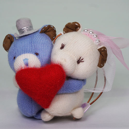 真紅のカシミヤ素材で作ったハートと一緒にいつも抱き合っているラブラブなハグベア♥。 新婦ベアはパールとレースの髪飾り、新郎ベアはトップハットがアクセントです。 ご結婚のプレゼント、結婚式のデコレーションに♪
