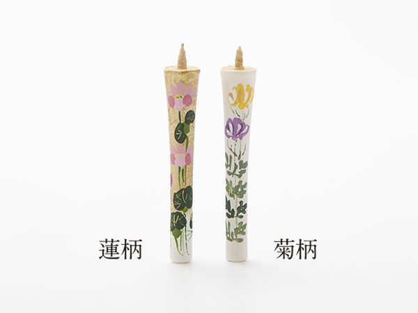 | 楽天市場で この製品を見るYahooショッピングで この製品を見る 絵ろうそく 蓮柄と菊柄 ■寸法:高さ10.8 × 直径約1.4(cm) ■号数:碇型3号 ■材料:米糠蝋 真綿 い草 ■製法:型入れ ■装丁:化粧箱 ■製造:日本製 滋賀県高島市 大與の製品ラインナップをみる > 和ろうそくと洋ろうそくの違い / 大與について > 絵ろうそくは東北地方を発祥としています。 寒さの厳しい東北では、冬季、仏花を手に入れることが非常に困難だったため、先人たちはろうそくに仏花の絵を描き、仏様にお供えしました。 夏場、お花が痛みやすい時期や、お花のないときなどに、仏花としてご使用いただけます。 お米のヌカから精製した蝋を用いて、型入れ、ケバ取りなど、すべての工程を和ろうそく職人の手作業にて仕上げています。 宗教用(お仏壇用やご寺院様用)をはじめ、茶の湯の席、ご進物や贈答用、お部屋用のろうそくなどにお使い下さい。 お米のヌカに含まれる蝋(ろう)から作られているため、蝋の垂れや、油煙が少なく、安心してお使いいただけます。 ひたすら地下から汲みだしてしまうだけの石油資源とは異なり、人が手をかければ枯渇することのない植物資源を用いた、心地よい日用品です。 表記の「号」は和ろうそくの寸法を示し、大きいほど燃焼時間も長くなります。 1号から5号までは小さな燭台でも安定して直立しますので、ご家庭用やご進物用、和食店や茶屋などのお店用にも扱いやすい大きさです。 近江手造り和蝋燭 大與(だいよ) ・ろうそくの素材と選び方 - 米ぬか 米ぬかろうそくに特徴的なのは、硬質でつるっとした肌合い、そして色ろうそくシリーズや豆ろうそくのカラーリングなど、ほどよい遊び心を含んだそのモダン性。火の力強さや美しさは、さすがにハゼ蝋燭には数歩譲りますが、蝋の垂れが少なく、芯がとても長持ちするという点、そしてお部屋にそっと溶け込むパッケージの雰囲気など、日常の中で使い心地の良さを味わえるのが米ぬかのろうそくです。 ・ろうそくの素材と選び方 - 櫨(ハゼ) ハゼろうそくの長所は何といっても、しっとりした独特な手触りと、これ以上はないといえるほどの火の美しさ。幾重にも薄く手掛けされてできる層にはどれ一本として同じものがなく、それはつまり、一本一本が唯一無二のリズムと呼吸を持っているということです。ときおり風もないのに不思議に波打つ様は、まるでそこに宿る小さな意思が、声なくこちらを見守っているかのようです。 どちらも特徴は異なれど、ときどき手に取って眺めたくなる味わいを持つ、真摯な逸品。 い草の煙も香しい、霊前供養の灯火として。毎日をすこしだけ清らかなものに変えてくれる、美しい日用品として。また書き物や読書の時間に、すこし名状しがたいような深い安らぎを与えてくれる明かりとしてお使い下さいませ。 お確かめ頂きたいこととお願い ・炎の周辺、特に上部には十分な空間をお取り下さい。 ・高温多湿、直射日光を避けて保管して下さい。 ・燃焼中、残芯が長くなりましたら、根元を1cmほど残し、芯切りばさみやピンセット等で不燃皿などへ取り除いて下さい。 ・消灯後は黒い部分を取り除かず、そのまま次の点火にご利用下さい。 ・すべてが手作業による品ですので、表記のサイズとはわずかに誤差が生じる場合もございますが、これも手づくり品の良さとお考え頂き、お傍でお使い頂ければ心より幸いでございます。 |