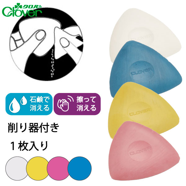 クロバー 三角チャコ(白・青・黄・赤)品番:12113-16入数:1サイズ:P.サイズ 70×85×10mm消し方:ブラシまたは粘着テープで落とす。