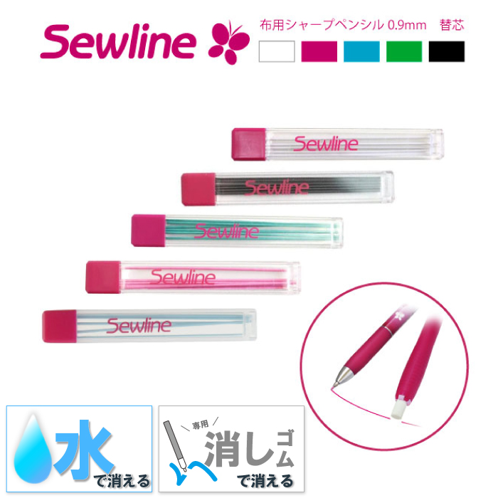 ソーラインシャープペンシル専用替芯(6本入)入数:6本入サイズ:0.9mmカラー:白・黒・緑・青・ピンク 全5色消し方:水洗い、中性洗剤で消える特別なセラミック芯は布に細く、はっきりとした線を書くことができます。