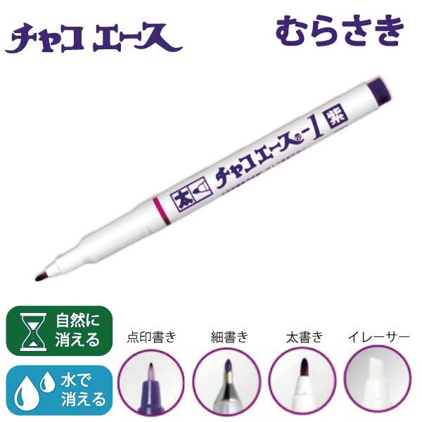 | チャコエース 紫品番:12232-54入数:1 カラー:紫ペン先: (太書+細書) (太書+消しペン) (細書) (太書) 用途:印付け自然に消える速度は 「線」で書いた場合は1〜2日位で消える。 「点」で書いた場合は7〜14日位で消える。 すぐに消したいときは水・イレーサー(消しペン)でも消えます。 ピンクより遅く消えます。 ※自然に消えるのは空気に触れることで消えます。消える早さは、筆圧、温度、湿度、インク量、書かれる素材により異なります。消えるまでの時間は目安であり確定しお約束するものではない事をご了承下さい。 ※印がついたまま重ねておいたり、袋等に入れた場合は消えるまでに余分な時間がかかります。 ※1本のインクで太・細を共有していますので片側を多用すると反対側が出ずらくなります。インクの出が悪くなったら、ペン先を下にして立てかけてください。 【 使用上の注意 】 ・使用する前に必ず共布でお試し下さい。 ・布地以外にも書けますが、全てに問題なく使用できるわけではありません。水を弾く仕様の紙や布、インクが染み込まないプラスチックや金属には不向きです。 また、木や革にご使用の際はその厚みや素材特性から「書けない」あるいは「書くことはできても消えない」場合があります。必ず事前に「書ける・消える」までのテストを行ってください。 ・水で消える特性のインクです。ペン芯に水をつけないで下さい。 ・同じ色でも他社製品で重ね書きしないで下さい。 |
