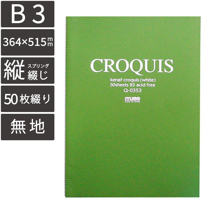 muse ホワイトクロッキーブック B3 深緑 Q-0353用紙:無地用紙サイズ :B3 364x515mm枚数:50枚綴り用途:パステル,鉛筆,色鉛筆,木炭,チョーク簀の目の入ったクロッキー用紙を本型の背付スパイラル綴じにしました。 鉛筆、コンテ、パステルののりが良く、スケッチ、レイアウト、プランニングなどのラフ用途に最適です。 |