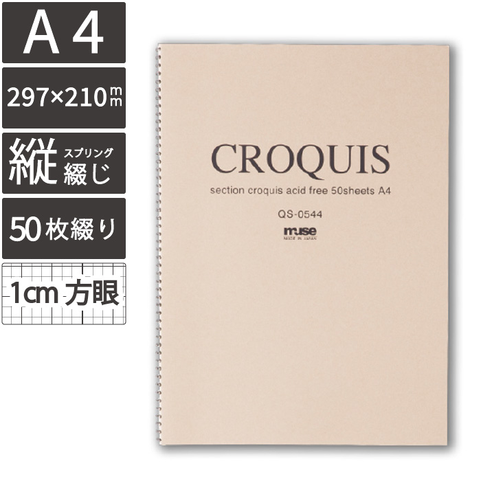 muse セクションホワイトクロッキーブックA4 QS-0544用紙:1cm方眼マス用紙サイズ :A4 297x210mm枚数:50枚綴り用途:パステル,鉛筆,色鉛筆,木炭,チョーク簀の目の入ったクロッキー用紙を本型の背付スパイラル綴じにしました。 鉛筆、コンテ、パステルののりが良く、スケッチ、レイアウト、プランニングなどのラフ用途に最適です。 |