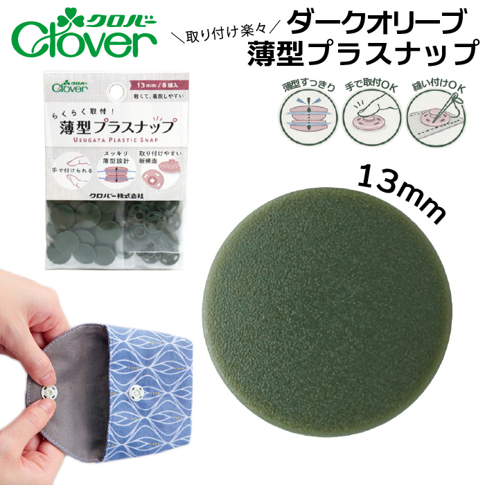 クロバー 薄型プラスナップ13mm入数:1色8組入りカラー:ダークオリーブ器具を使わず取り付けられる、プラスチック製のスナップです 使いやすい10色展開で、作品に合わせて色を選べます