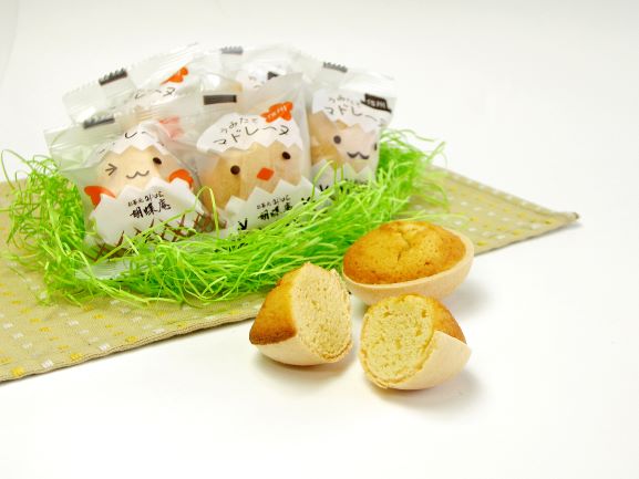 卵の殻をあしらった最中生地にしっとりふわふわ伝統的な洋菓子のマドレーヌを胡蝶庵流にアレンジし、和と洋を融合したオリジナル焼き菓子を作りました!