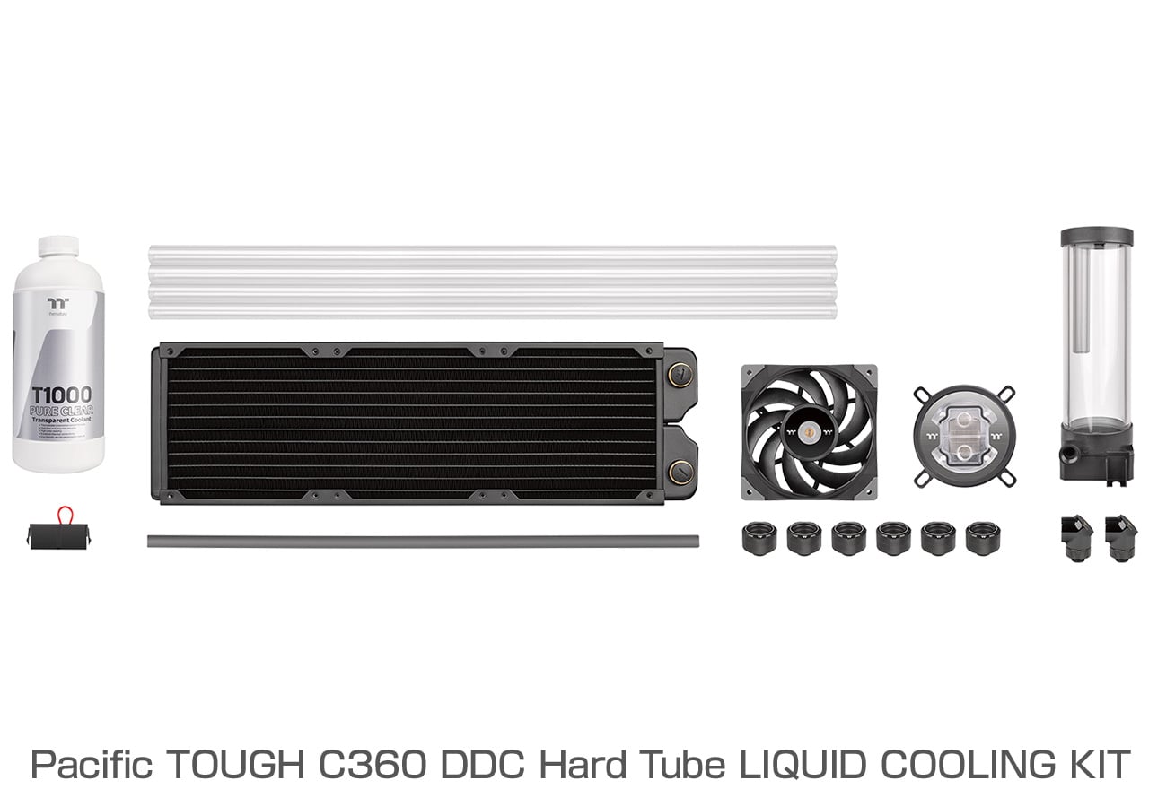 | 薄型設計のラジエーター、高静圧ファンとPETGチューブを同封。カスタム水冷製品「Pacific」シリーズのオールインワンキット [特徴] ・Pacific W7 Non RGB CPUウォーターブロック ・Pacific PR22-DDCポンプ一体型リザーバー ・Pacific C360ラジエーター ・Pacific C-Pro G1/4 PETG 16mm OD Compressionフィッティング ・Pacific G1/4 90 Degree Adapterフィッティング× ・TOUGHFAN 12ファン ・T1000 Coolant Pure Clearクーラント ・V-Tubler PETGチューブ Thermaltake カスタム水冷製品とは? 既存の簡易水冷キットとは異なり、ポンプ・ウォーターブロック・ラジエータ・リザーバーなど、全てのパーツを自由に組み合わせられるラインナップをご提供いたします。必要に応じてラジエータやウォーターブロックを追加することができますので、効率的に温度を下げられるだけでなく、メカニカルな外観を楽しむことができます。 ※ 本製品ではCPUを冷却するベーシックループを構築できます。 [仕様] 製品名 Pacific TOUGH C360 DDC Hard Tube LIQUID COOLING KIT 内容物 CPUウォーターブロック:Pacific W7 Non RGB CPU Water Block×1 ポンプ+リザーバータンク:Pacific PR22-DDC Pump/Reservoir Combo×1 ラジエーター:Pacific C360 Radiator×1 (399L×119W×29.5H) フィッティング:Pacific C-Pro G1/4 PETG 16mm OD Compression (Black)×6、Pacific G1/4 90 Degree Adapter (Black)×2 ラジエーターファン:TOUGHFAN 12 Radiator Fan×3 クーラント:T1000 Coolant Pure Clear 1000ml×1 チューブ:V-Tubler PETG Tube 16mm OD 500mm×8 バックプレート:Intel and AMD Universal Backplated & Mounting Kit 通電テストキット:24pin ATX Bridge Tool×1 サーマルグリス:Thermaltake Thermal Grease×1 保証期間 1ヶ月 型番 CL-W306-CU12BL-A JANコード 4713227528177 発売時期 2022年 9月下旬 |