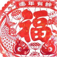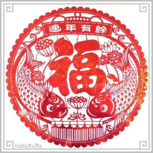 切り絵(剪紙)風のシールです。 紙を使った本物の切り絵ではなく、透明なフィルムの上に図案がプリントされています。 大きな福の文字の下には連年有余という、縁起のよい言葉が書かれていますね。 図案的には「双魚(そうぎょ)」という、魚が2匹描かれた吉祥図案になっています。蓮の花もおめでたい図案ですよ。