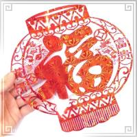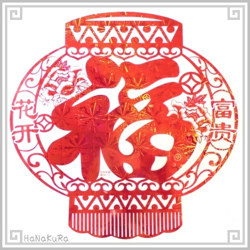 切り絵(剪紙)風のシールです。 紙を使った本物の切り絵ではなく、透明なフィルムの上に図案がプリントされています。 提灯の中に大きな福の文字と牡丹がデザインされています。 両端には牡丹の花とセットで使われる「花開富貴」という縁起言葉が書かれていますよ。