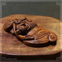 柘植(ツゲ)の木材を彫刻した蝙蝠(こうもり)の小さな根付けです。 口にくわえているのは「如意(ルーイ―、にょい)」という、物事が思い通りに進む象徴となる縁起物です。 蝙蝠自体も福の象徴なので、なかなか縁起のいいデザインですよ。 中国の彫刻師さんの手彫り作品で、撮影した現品をお届けします。 |