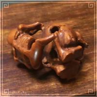 柘植(ツゲ)の木材を彫刻した骸骨の小さな根付けです。 頭骸骨を抱えながら、空気椅子に座っているかのようなポーズをする骸骨です。 頭蓋骨の口と目、頭部の穴は繋がっています。 中国の彫刻師さんの手彫り作品で、撮影した現品をお届けします。 |