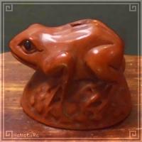 柘植(ツゲ)の木材を彫刻したカエルの小さな根付けです。 岩の上に、どっしりとした蛙(かえる)がしっかりとしがみついています。 中国の彫刻師さんの手彫り作品で、撮影した現品をお届けします。 |