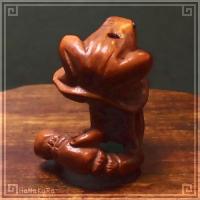 柘植(ツゲ)の木材を彫刻したカエルの小さな根付けです。 蓮の葉の上に蛙(かえる)が乗っています。 葉から上は地上、下部にある蓮根部分は水の中をイメージして作られています。(284と同構図です) 中国の彫刻師さんの手彫り作品で、撮影した現品をお届けします。 |