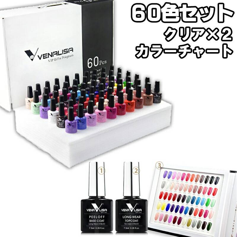 セット内容:カラージェル60色セット+ベースジェル+トップジェル+カラーチャート 容量:7.5ml 対応ランプ:UVライト・LEDライト(一部適応外) タイプ:ソークオフ
