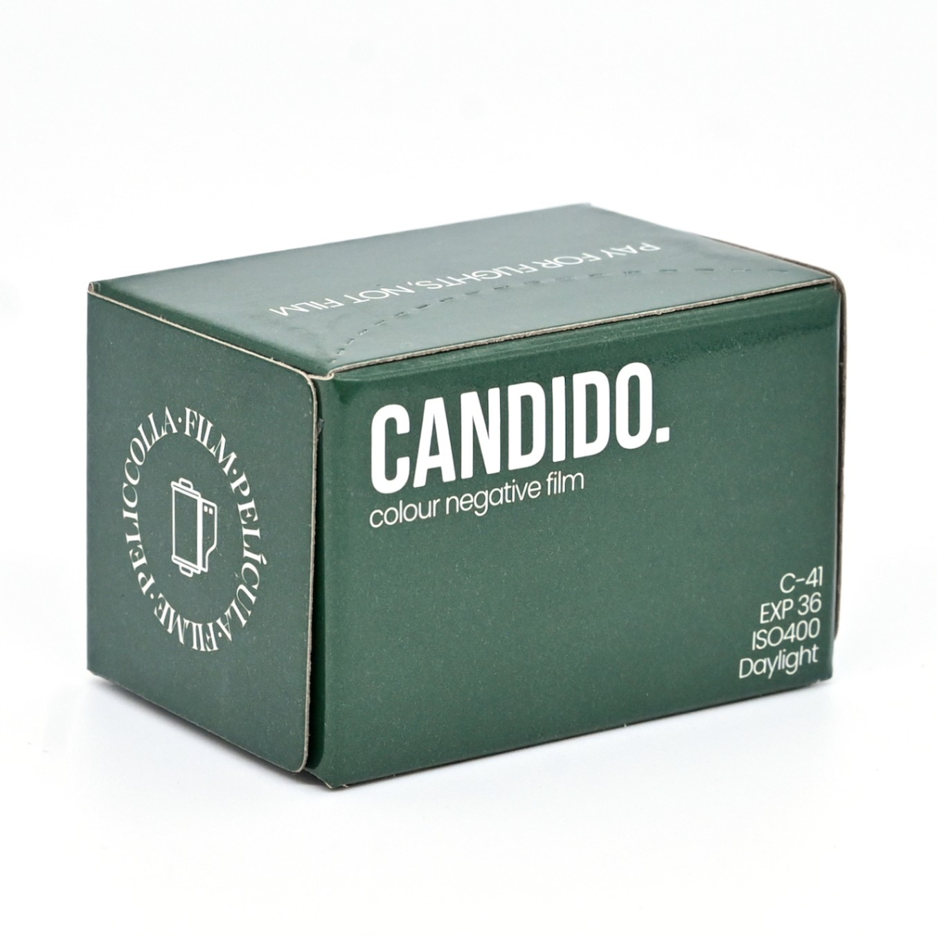 | カラーネガフィルム CANDIDO 400 36枚撮り 1本です。映画用デーライトタイプのフィルムを写真用C-41現像が出来るようにしたフィルムです。36枚撮りになってDXコードが付きました。映画用フィルム特有の赤い滲みや斑点が写ります |