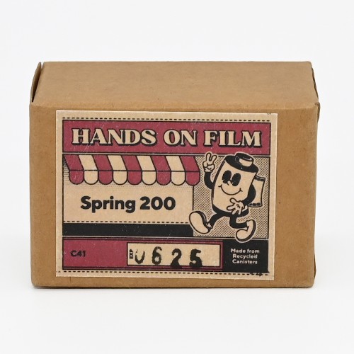 シール貼り付けの外箱、使用済みパトローネのリサイクルと手作り感満載のカラーネガフィルム HANDS ON FILM / SPRING 200 36枚撮り 1本です。映画用デーライトフィルムを写真用C-41現像が出来るようにしたフィルムです。