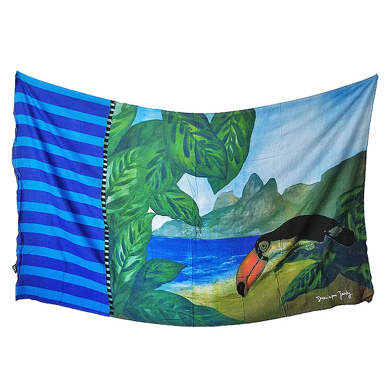 トゥッカーノ・リオデジャネイロビーチ柄【ブラジルカンガ】パレオ | ブルーマルチ ブラジルの国鳥、「トゥッカーノ」がビーチを覗いているようで素敵な柄のブラジルカンガ! 大きめのリアルなデザインがカッコいいアイテム! パレオとしてはもちろん、テーブルクロスやマルチカバーとしても空間が華やぎます! カラフルでブラジルらしい!様々なオリジナルの使い方を楽しめる万能大判布です!