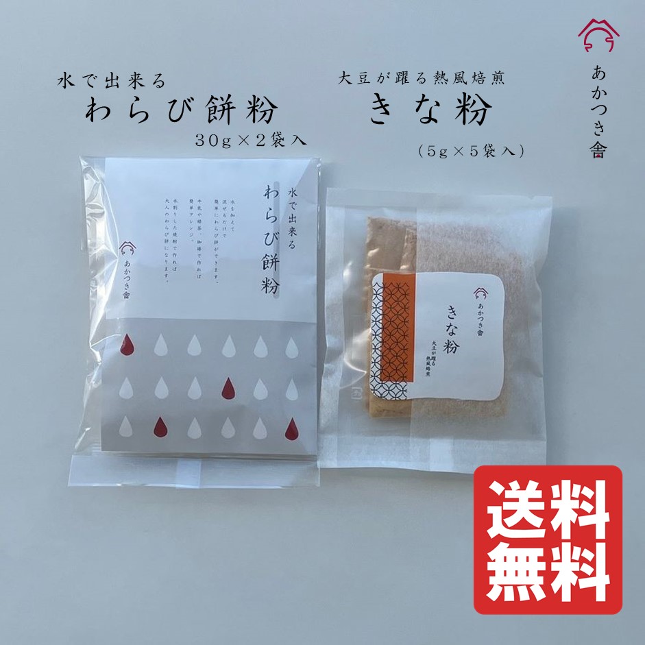 水で出来るわらび餅粉(30g×2袋入)と、きな粉(5g×5袋入)がセットになった送料無料の商品です。