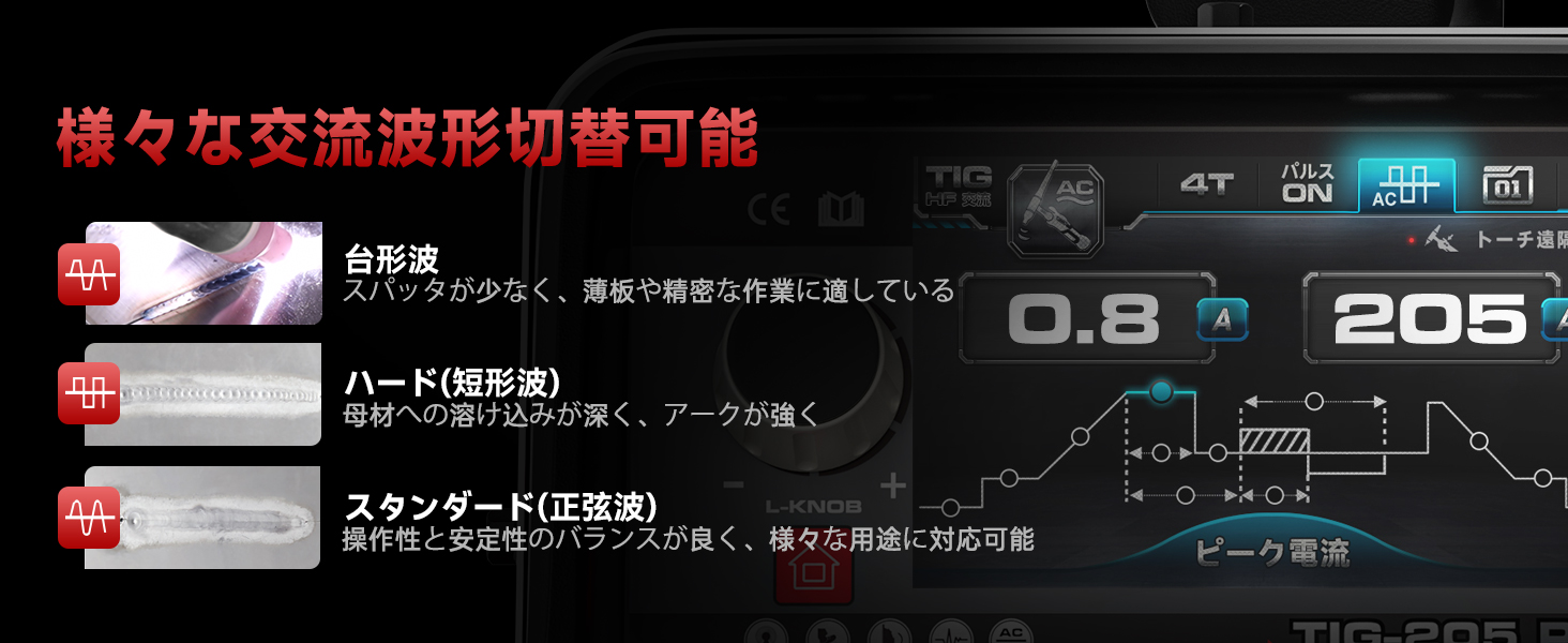 交流波形切替可能、台形波、スタンダード(正弦波)、ハード(短形波)の3種類があり、ビード幅溶け込みにより選択します。