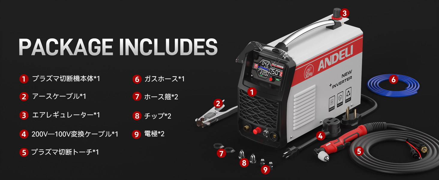 プラズマ切断機本体,プラズマ切断トーチ、アースケーブル2M、ガスホース3M×1、ホース箍×2、消耗品セット(電極×2、チップ×2 ホースバーブ×2、コネクタ×2)、エアーレギュレーター×1