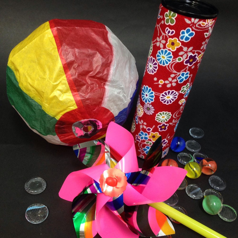 おはじき約14個,ビー玉約7個,風車1個,紙風船1枚,友禅万華鏡1個