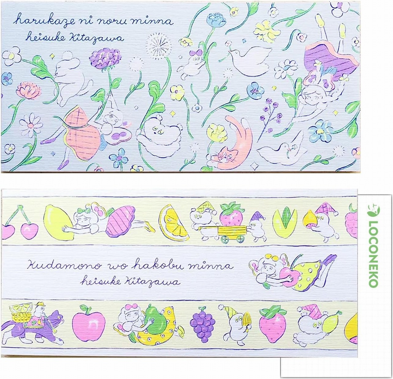 【セット内容】北澤平祐 一筆箋 2種セット【はるかぜにのるみんな/くだものをはこぶみんな】+ ロコネコカード