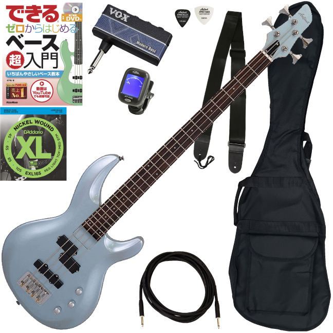 PJ ピックアップを組み合わせたサウンドバリエーションと、コンパクトで軽くバランスの良いボディによる演奏性の良さが魅力の"Aria Pro II IGB-STD"に、ソフトケース、練習に便利な9種のリズム・パターンを内蔵したヘッドホンアンプ"VOX amPlug3" 、入門者向けDVD付き教則本(リットーミュージック)、クリップチューナー、ストラップ、シールド(3m)、ピック、替弦(D'Addario EXL165)をセットにしました。