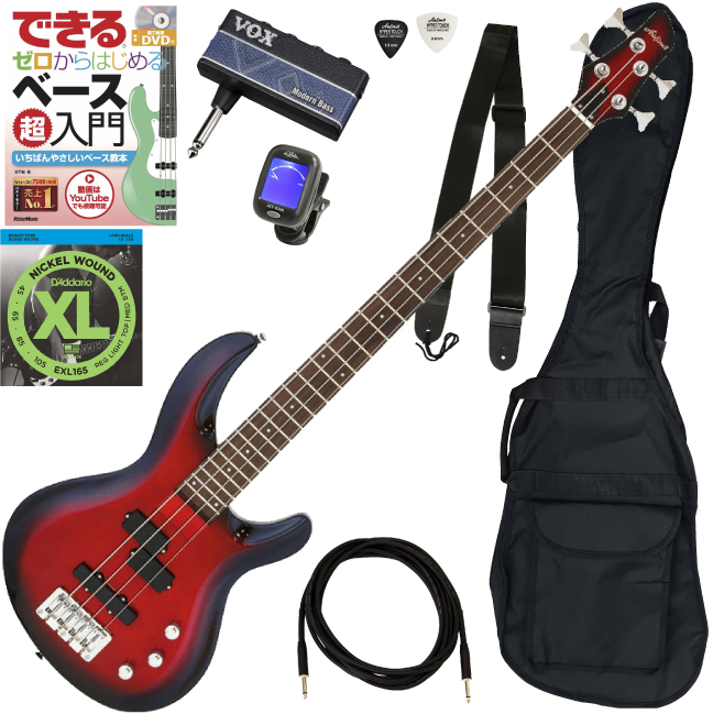 PJ ピックアップを組み合わせたサウンドバリエーションと、コンパクトで軽くバランスの良いボディによる演奏性の良さが魅力の"Aria Pro II IGB-STD"に、ソフトケース、練習に便利な9種のリズム・パターンを内蔵したヘッドホンアンプ"VOX amPlug3" 、入門者向けDVD付き教則本(リットーミュージック)、クリップチューナー、ストラップ、シールド(3m)、ピック、替弦(D'Addario EXL165)をセットにしました。